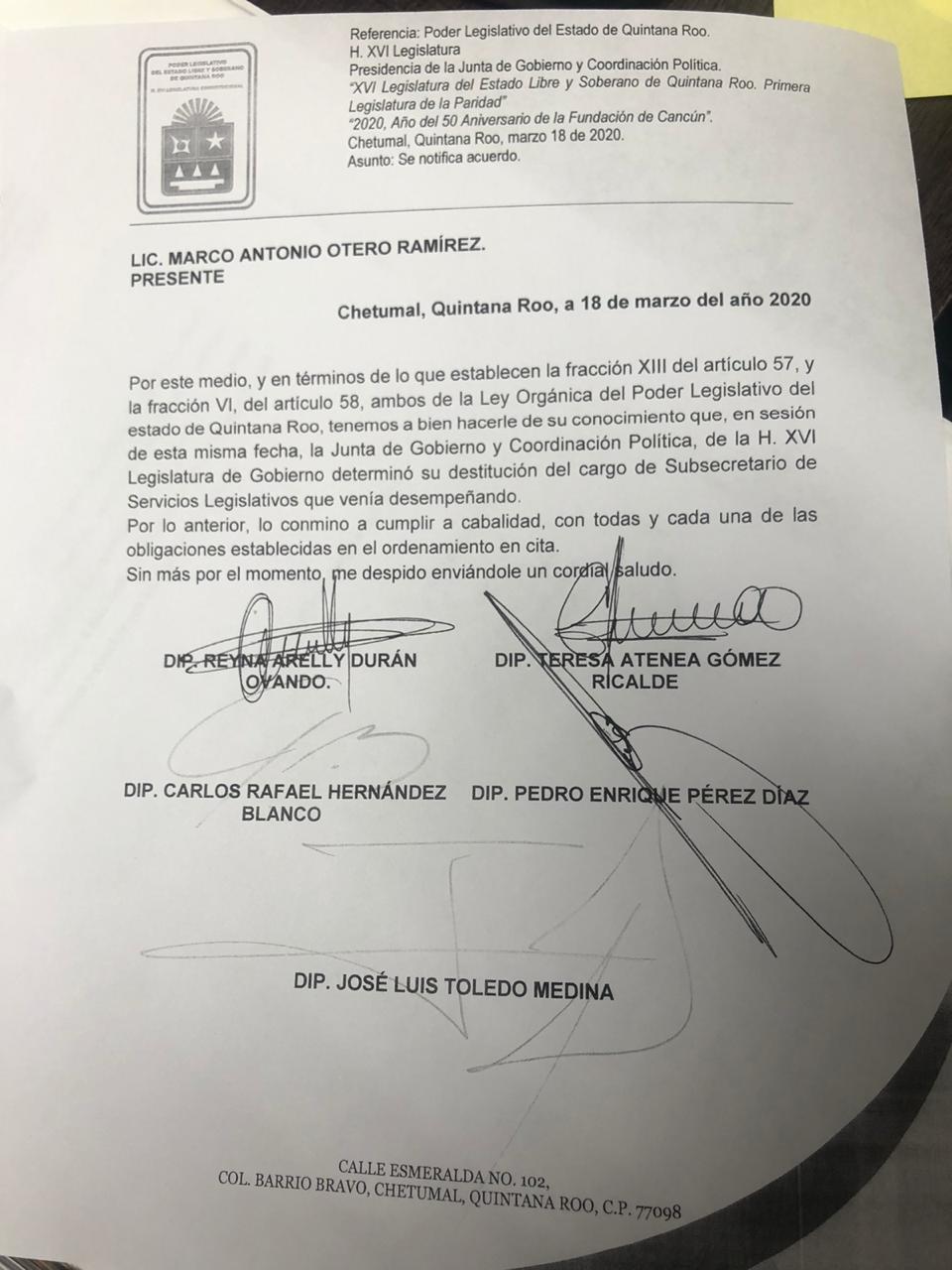 Chetumal.- La Junta de Gobierno y Coordinación Política del Congreso del Estado, todavía presidida por Reyna Durán Ovando, destituyó esta noche al secretario general del Poder Legislativo, Arturo Castro Duarte, así como a su subsecretario de Acuerdos Administrativos, Marco Antonio Otero Ramírez.