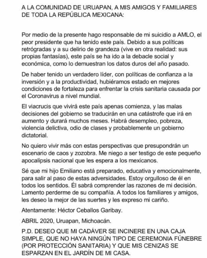 A continuación se reproducen fragmentos del escrito que se le atribuye al hoy fallecido, en los que critica las decisiones del gobierno de AMLO, a quien culpa de la debacle económica y política que vive el país, según su opinión.
