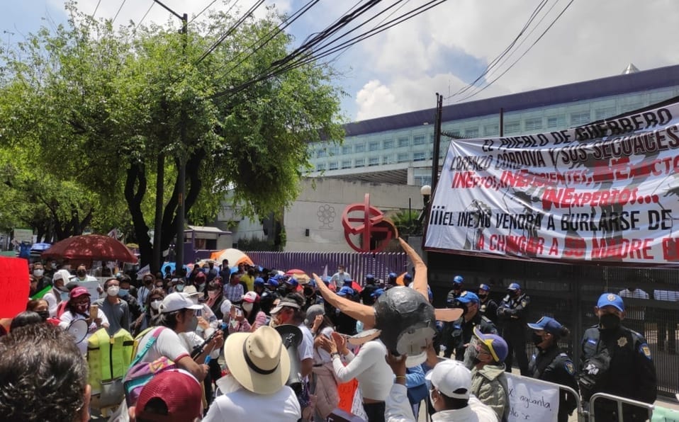 A dicha protesta se suman integrantes del Frente Nacional Obradorista y acusan al INE de intervenir en los procesos electorales y exigen la renuncia y juicio político del presidente del INE, Lorenzo Córdova y del consejero Ciro Murayama.