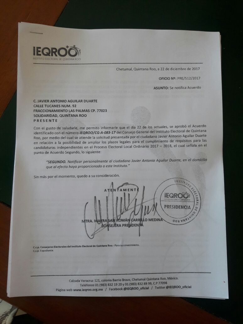 Playa del Carmen.- El Instituto Electoral de Quintana Roo (Ieqroo) le dio un “portazo” a los candidatos independientes al negarse a otorgar una prórroga en el cumplimiento de los requisitos legales, afirmó Javier Aguilar Duarte, quien señaló que de entrada es imposible contar con lo exigido dentro del plazo, ya que el Servicio de Administración Tributaria (SAT) está de vacaciones hasta el 8 de enero y abrir una cuenta fiscal tarda un mes.