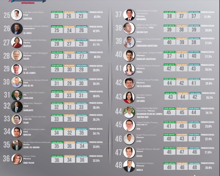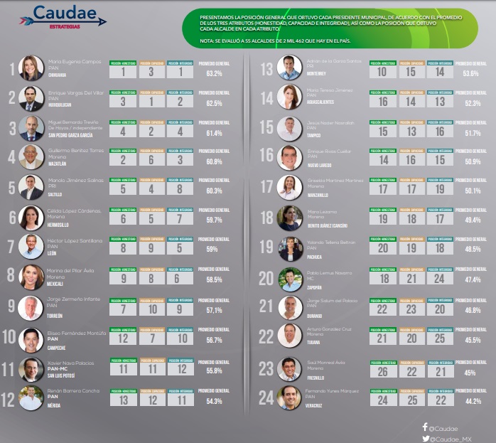 En esta sexta entrega mensual, la Primera Autoridad de Benito Juárez volvió a ser colocada en las primeras 20 posiciones gracias a las calificaciones recibidas por ciudadanos cancunenses vía telefónica. En el rubro de honestidad alcanzó el lugar 19 a nivel nacional; en capacidad, fue ubicada en el 18; y en integridad, subió a la posición 17.