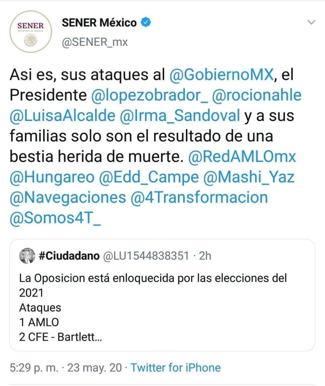 El post de la Sener decía: “Así es, sus ataques al @GobiernoMX, el Presidente Lopez Obrador @rocionahie @LuisaAlcalde @lrmaSandoval y a sus familias solo son el resultado de una bestia herida de muerte”.