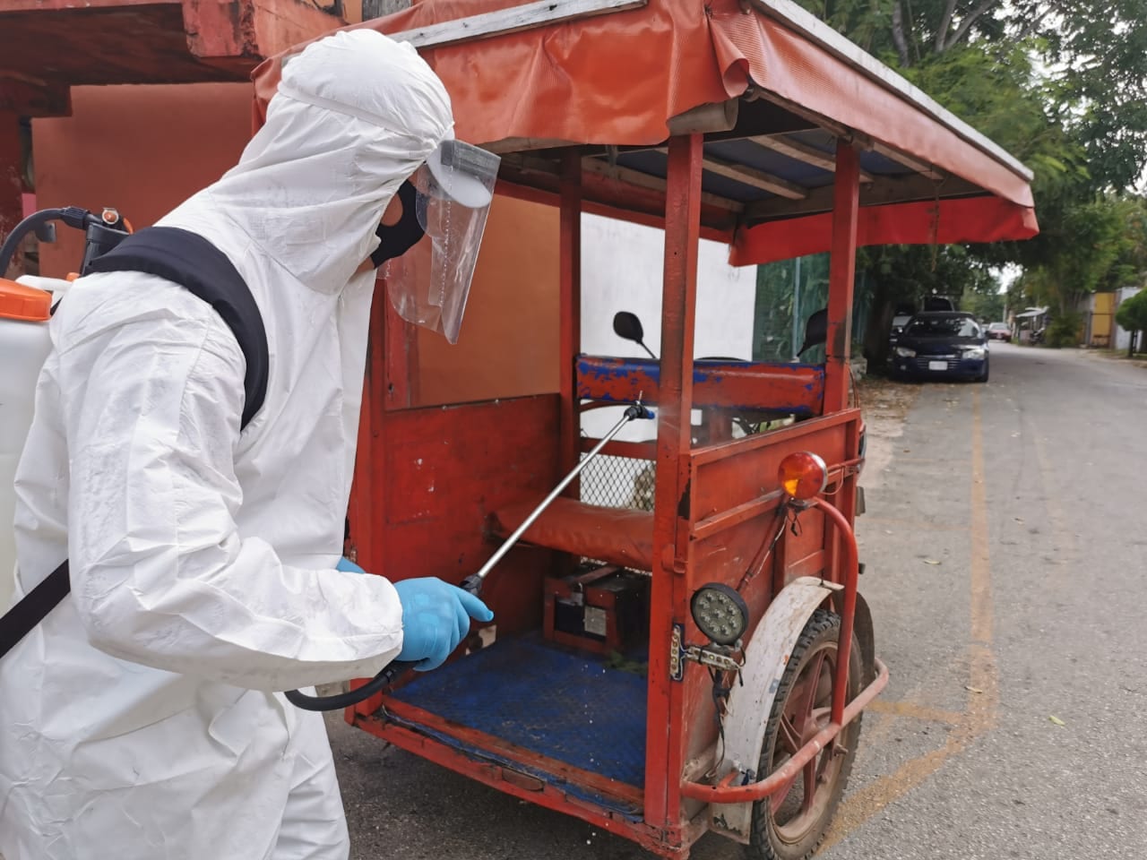 Puerto Morelos.- Como parte de las medidas de prevención para contener la pandemia por Covid-19 en esta comunidad, el gobierno de la presidenta municipal Laura Fernández Piña lleva a cabo trabajos de desinfección en unidades de mototaxis, que son el sistema de transporte tradicional de la localidad.