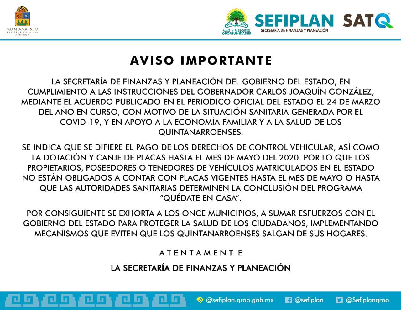 Con motivo de la actual contingencia sanitaria por el coronavirus, covid-19, la Secretaría de Finanzas y Planeación de Quintana Roo (Sefiplan), anunció a través de un comunicado que el pago de derechos de control vehícular y el canje de placas podrá realizarse hasta mayo del 2020.