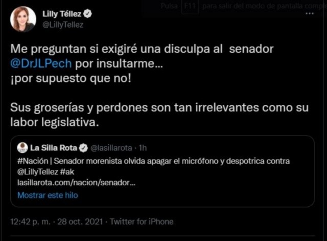 Tras el insulto, la senadora Téllez dijo que las groserías de Pech son tan irrelevantes como su labor legislativa.