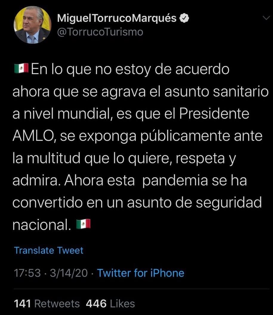 “En lo que no estoy de acuerdo ahora que se agrava el asunto sanitario a nivel mundial, es el que Presidente AMLO, se exponga públicamente ante la multitud que lo quiere, respeta y admira. Ahora esta pandemia se ha convertido en un asunto de seguridad nacional”, decía el mensaje que el secretario de Turismo federal publicó en su cuenta de Twitter.