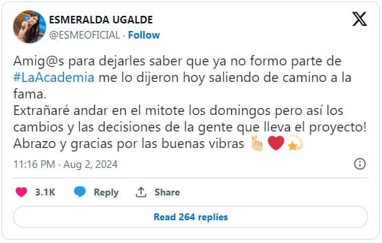 “Amigos, para dejarles saber que ya no formo parte de La Academia, me lo dijeron hoy saliendo de ‘Camino a la Fama’. Extrañaré andar en el mitote los domingos pero así los cambios y las decisiones de la gente que lleva el proyecto”, explicó.
