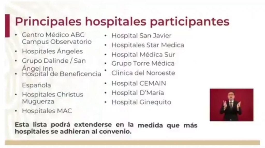 Estos algunos de los hospitales partícipes de este convenio. Entre ellos se encuentran el ABC, los Ángeles, Médica Sur, entre otros. Se acordó que los precios para los derechohabientes serán los mismos que manejan el IMSS y el ISSSTE.