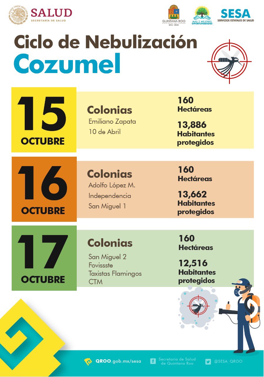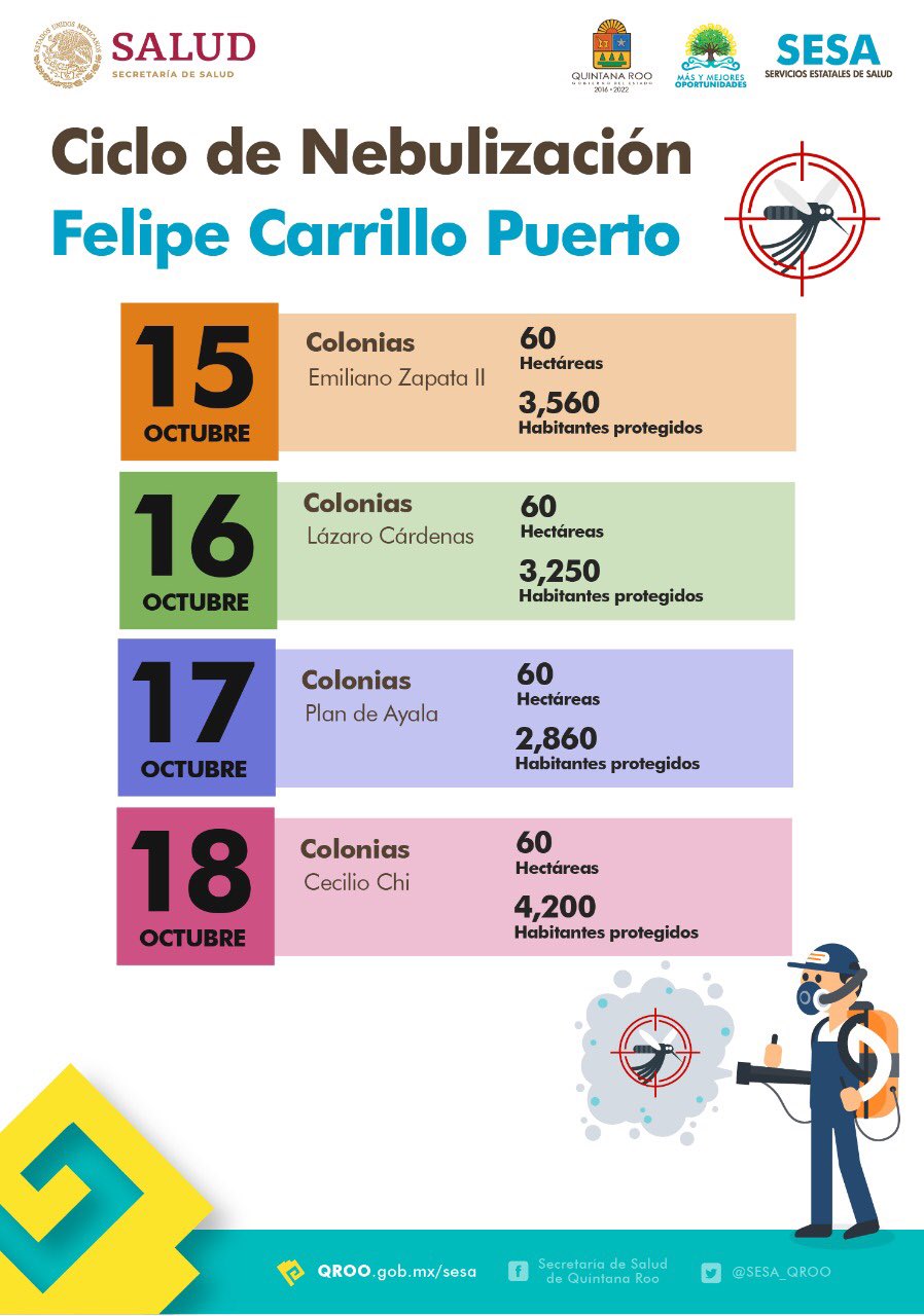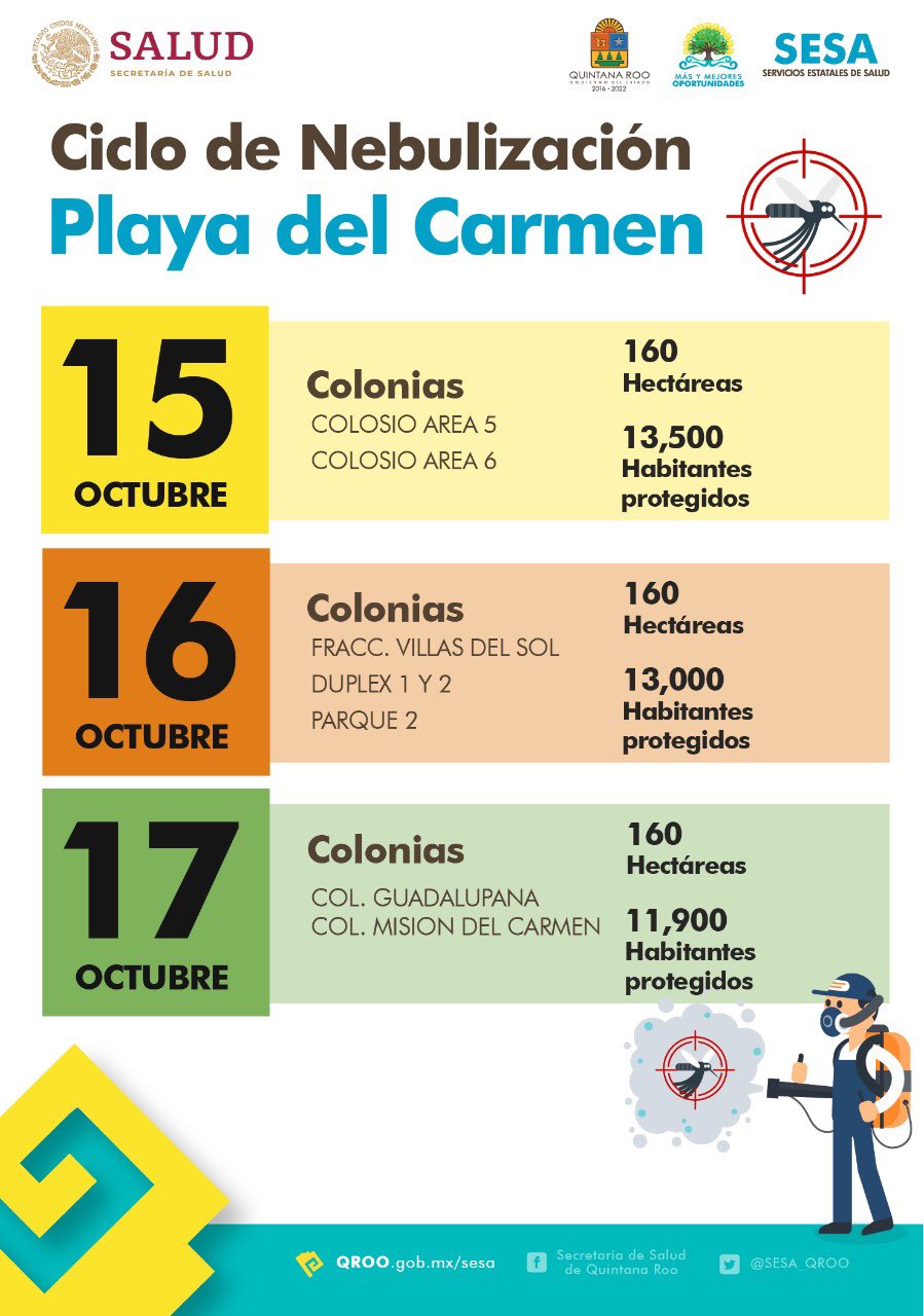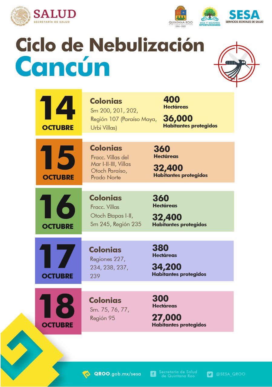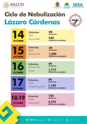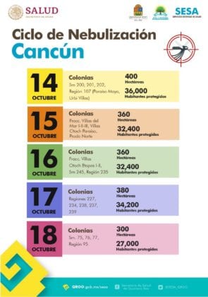La Secretaría estatal de Salud anunció que del 14 al 18 de octubre se realizará el décimo ciclo de nebulización en Cancún, para después seguir en los demás municipios de Quintana Roo.