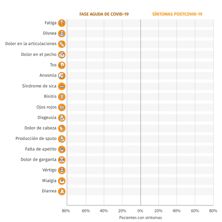 Sólo el 12.6% se encontraba completamente libre de síntomas relacionados al virus; el 32% tenía uno o dos síntomas; el 55% de los analizados tenía 3 o más síntomas.