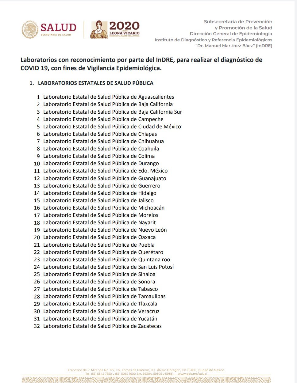 Los laboratorios Estatales de Salud Pública corresponden a los 31 estados del país y al de la Ciudad de México, y no es necesario enlistarlos uno por uno. Por lo que se entiende que cada laboratorio estatal público cuenta con el reconocimiento para realizar la prueba de coronavirus.