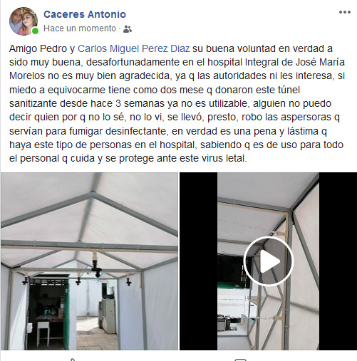 José María Morelos, Quintana Roo.- El túnel sanitizante donado hace dos meses al Hospital Integral de José María Morelos ha quedado inservible, por el supuesto robo de sus aspersores, denunció el director municipal de Salud, Antonio Cáceres.