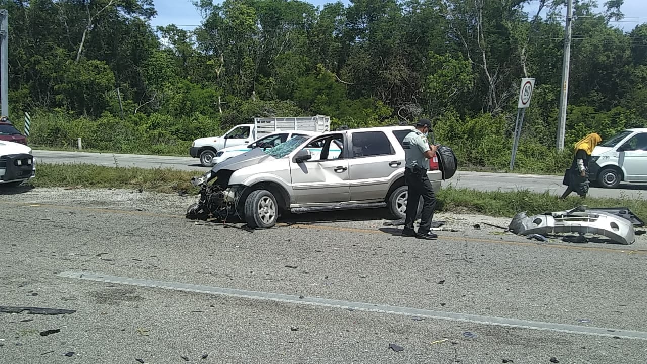 Playa del Carmen, Quintana Roo.- Un vehículo se cruzó al carril contrario de la carretera federal 307 y se estrelló de frente contra otros dos coches esta tarde a la altura de Punta Venado, con saldo de cinco personas lesionadas.