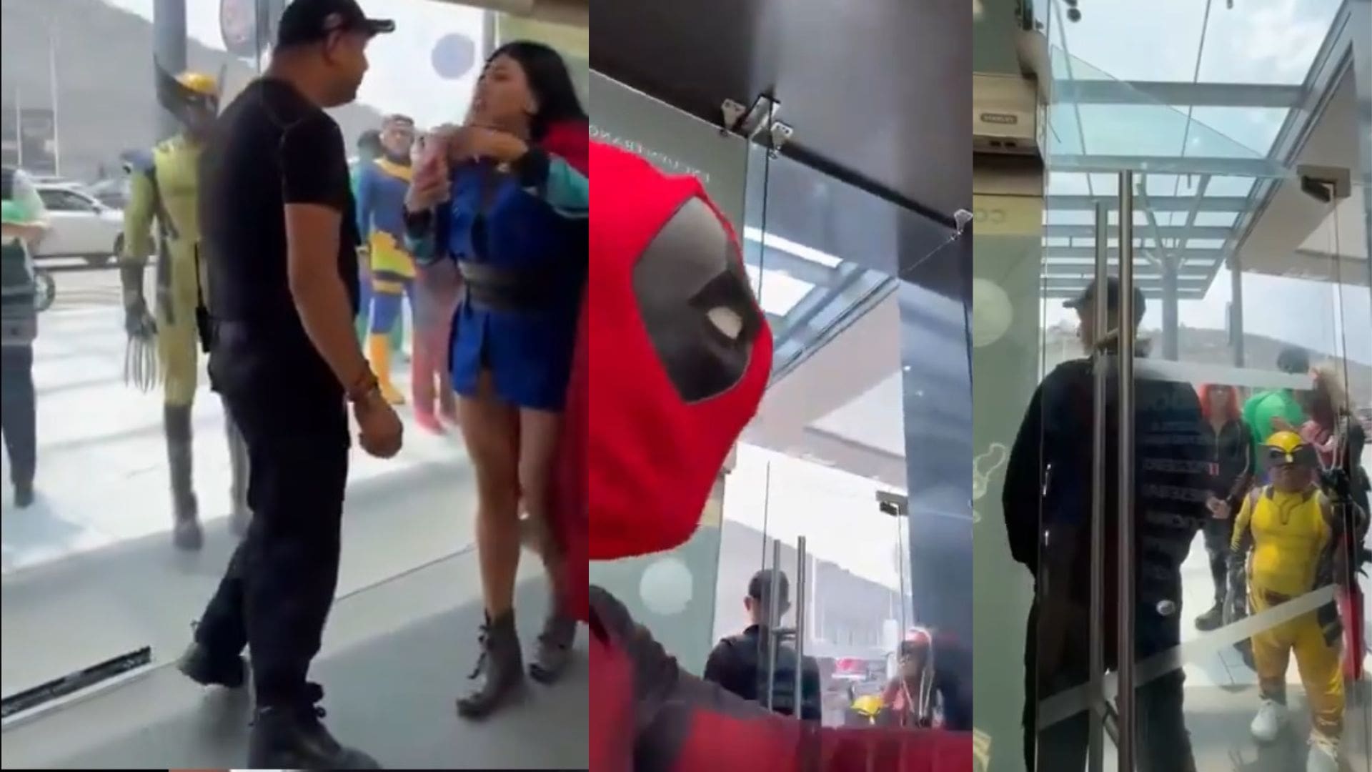 Un grupo de jóvenes acudieron a una plaza comercial para ver la nueva película de Marvel, “Deadpool y Wolverine”; sin embargo, fueron retenidos en la entrada por oficiales que señalaban que no podían entrar disfrazados de superhéroes.
