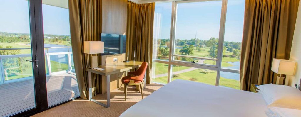 Días hermosos y muy soleados en verano son perfectos para disfrutar de días de golf en el Pilar Golf Club a las afueras de Buenos Aires, uno de los campos de golf de 27 hoyos más atractivos de la región. En este campo se encuentra ubicado el Hilton Pilar, un hotel elegante contemporáneo donde los visitantes pueden descansar mientras gozan de una magnífica vista al campo de golf. El hotel ofrece múltiples piscinas, canchas de tenis, canchas de fútbol, cancha multideportiva, pista de atletismo (trote), elegantes salas de reuniones, un exclusivo restaurante, dos bares, y un spa de clase mundial con dos niveles, que incluye tres hidromasajes, saunas y varias salas de tratamiento.