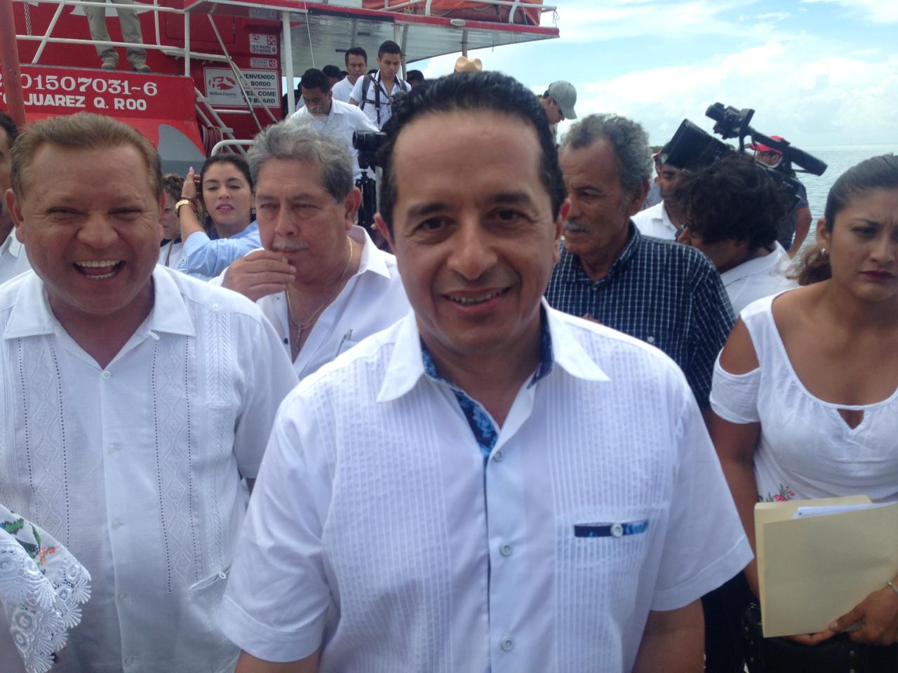 El gobernador abordó una embarcación para cruzar a Holbox, donde inspeccionará una instalación de alcantarillado, reencarpetamiento de calles, construcción de banquetas, espacios deportivos y pintado de fachadas. También visitará el Centro de Salud, una escuela, y entregará reconocimientos a miembros de cooperativa pesquera.