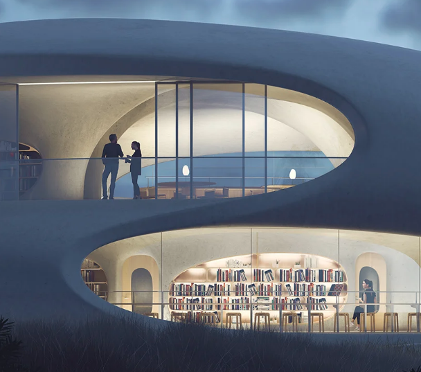 La nueva biblioteca del futuro posee una forma similar a una estructura alienígena y está situada junto al mar. Se diseñó como un lugar multipropósito para que los visitantes escapen del bullicio diario y sueñen con viajar a otros mundos.