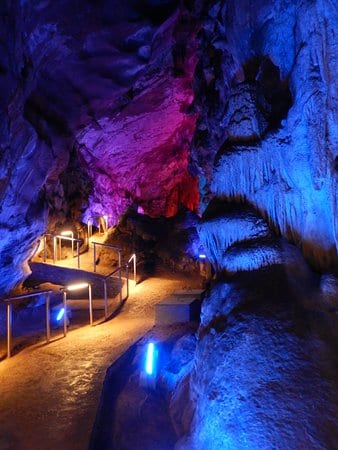 Durante el recorrido, iluminado con luces azules y moradas, aunque la mayoría de los turistas se adentra hasta llegar a los 100 metros bajo tierra, aún hay otro kilómetro que no se ha habilitado para el público.