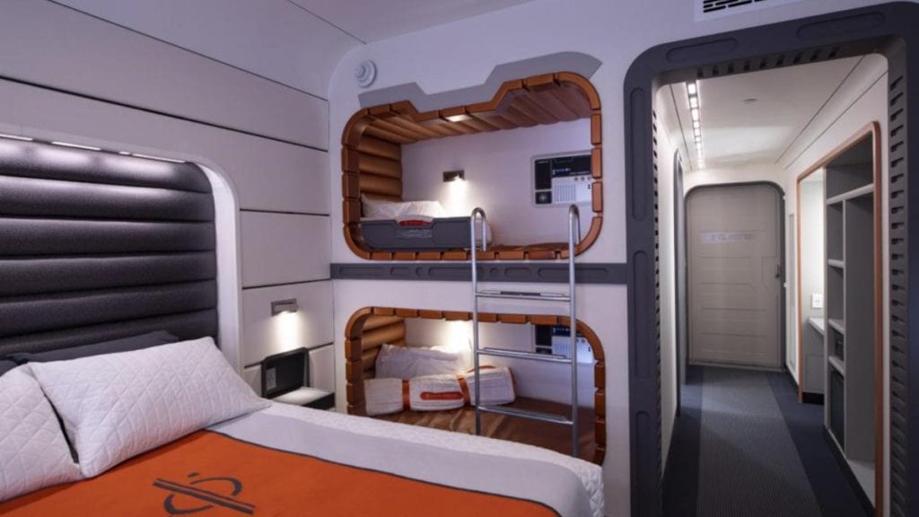 En tanto, la suite imita perfectamente el estilo de una nave que bien podría aparecer en Star Wars, aunque sin ese aspecto “desgastado” que caracteriza algunos escenarios de la saga. Se trata de una suite familiar, con una cama convencional y dos compartimentos en la pared que fungen como litera para niños.