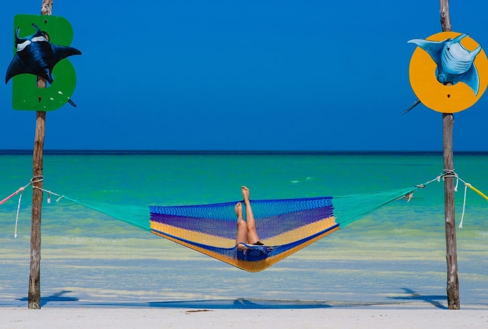 Una de las actividades favoritas en Holbox es relajarse frente a sus cristalinas aguas mientras están en un camastro o en una hamaca justo dentro del mar: una manera más refrescante de disfrutar de la playa.