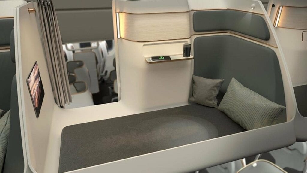 La propuesta de Cloud Capsules -que funcionarán como la extensión de uno de los asientos de la fila- estaría compuesta por compartimientos 1.90 centímetros de longitud, donde los pasajeros podrían estirar mucho más las piernas que en los asientos convencionales, incluso acostarse.