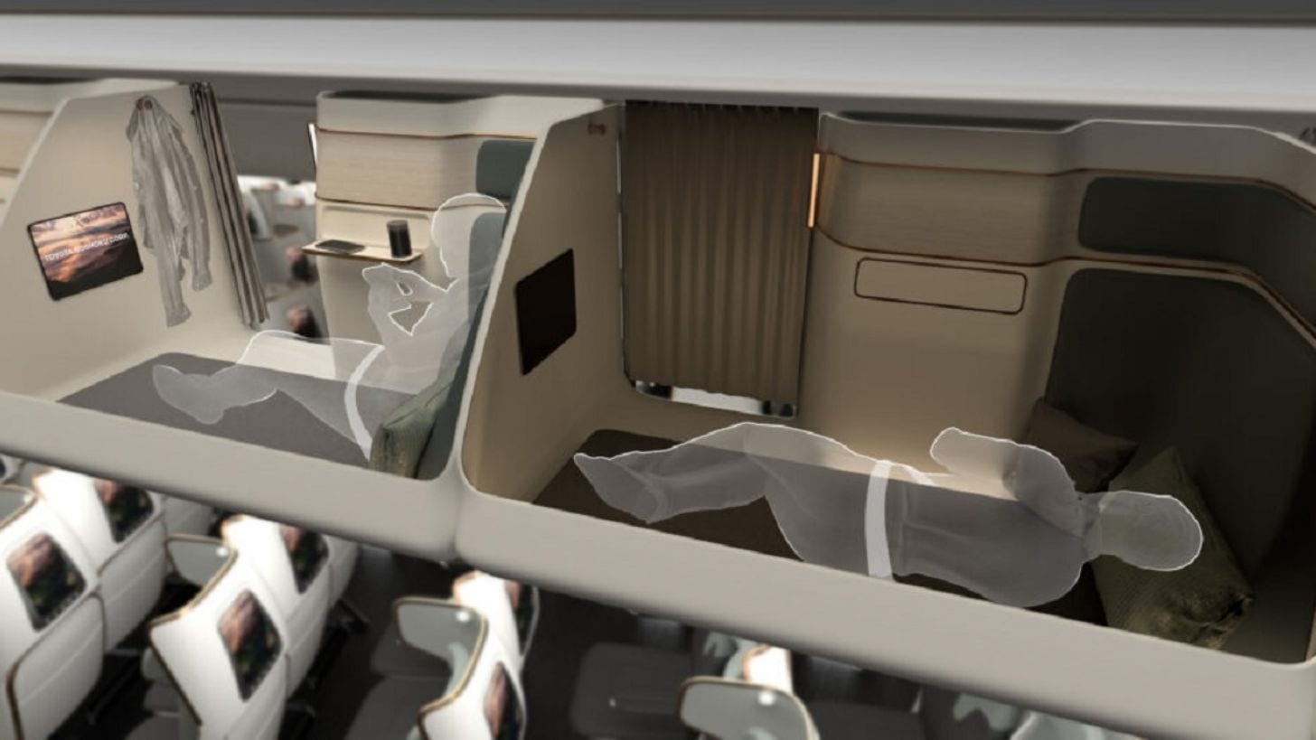La propuesta de Cloud Capsules -que funcionarán como la extensión de uno de los asientos de la fila- estaría compuesta por compartimientos 1.90 centímetros de longitud, donde los pasajeros podrían estirar mucho más las piernas que en los asientos convencionales, incluso acostarse.