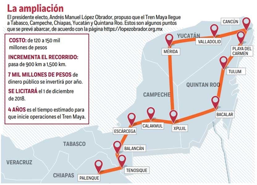 Ahora el tren correrá por los estados de Quintana Roo, Yucatán, Campeche, Tabasco y Chiapas, la nueva ruta pasará por Escárcega, Campeche, hacia la ciudad del estado, pasando por Mérida, Yucatán y de ahí hacia Cancún, pasando por Valladolid, Yucatán.