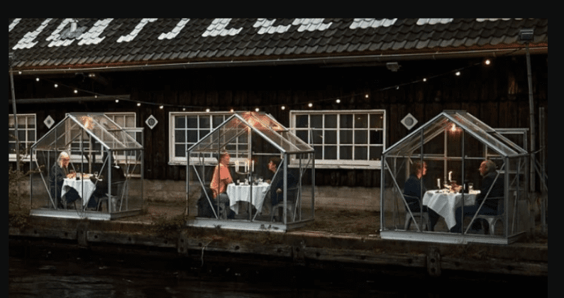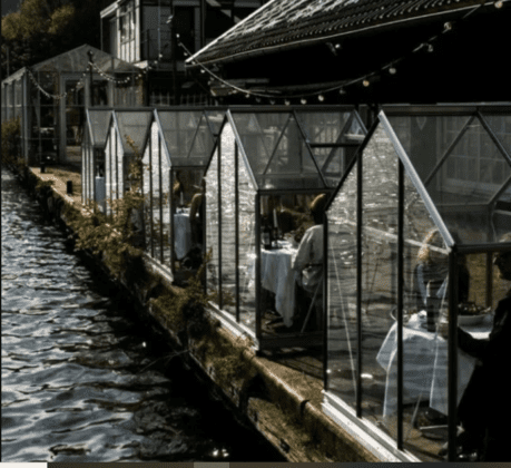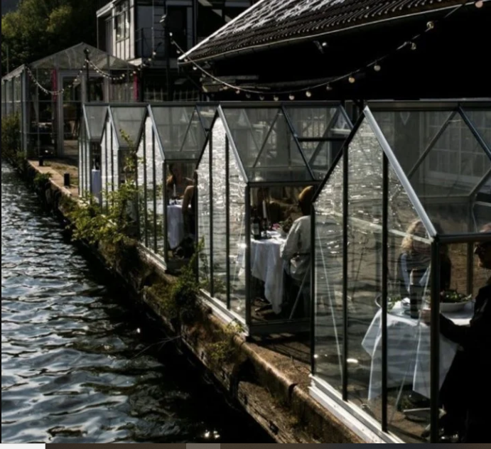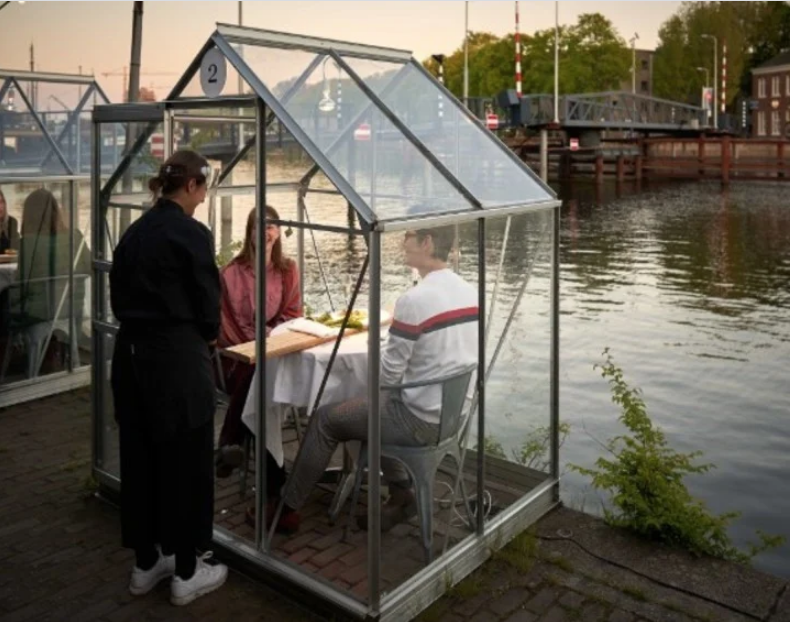 La propuesta permite que sean instalados a lo largo de un canal los invernaderos que contienen una pequeña mesa redonda y dos sillas, y que se colocan espaciados entre sí, listas para recibir a futuros clientes temerosos a la idea de compartir una comida en grupo.