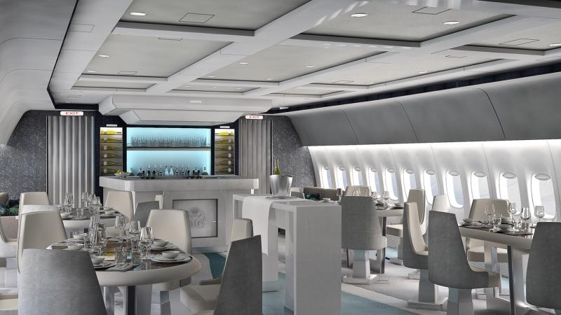 Este exclusivo avión ofrece un espacio social separado que incluye mesas de comedor, donde poder disfrutar de una gastronomía galardonada con Estrellas Michelín y una bodega aérea con régimen de “Todo incluido” (amplia selección de vinos, champagnes, cervezas y licores premium).