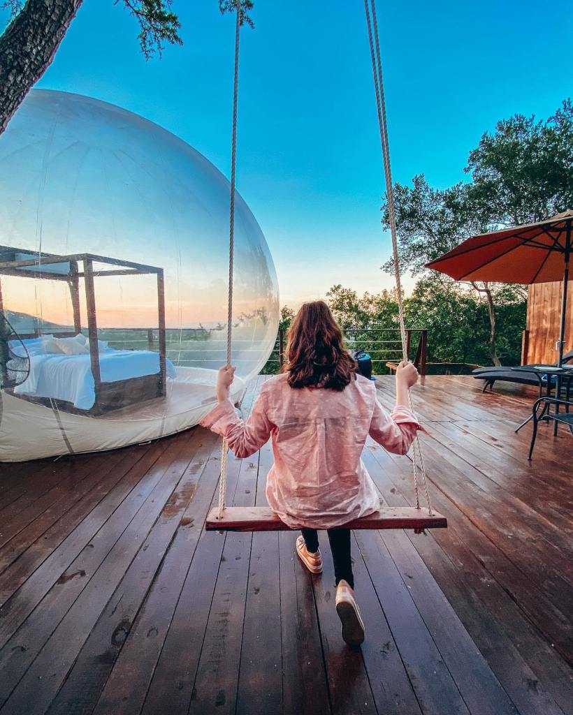 La propiedad, rodeada de montañas y vegetación, cuenta con cuatro burbujas instaladas sobre decks. Disponen de jacuzzi privado al aire libre, camastros, columpios y mallas gigantes suspendidas para que los huéspedes puedan tumbarse en ellas.