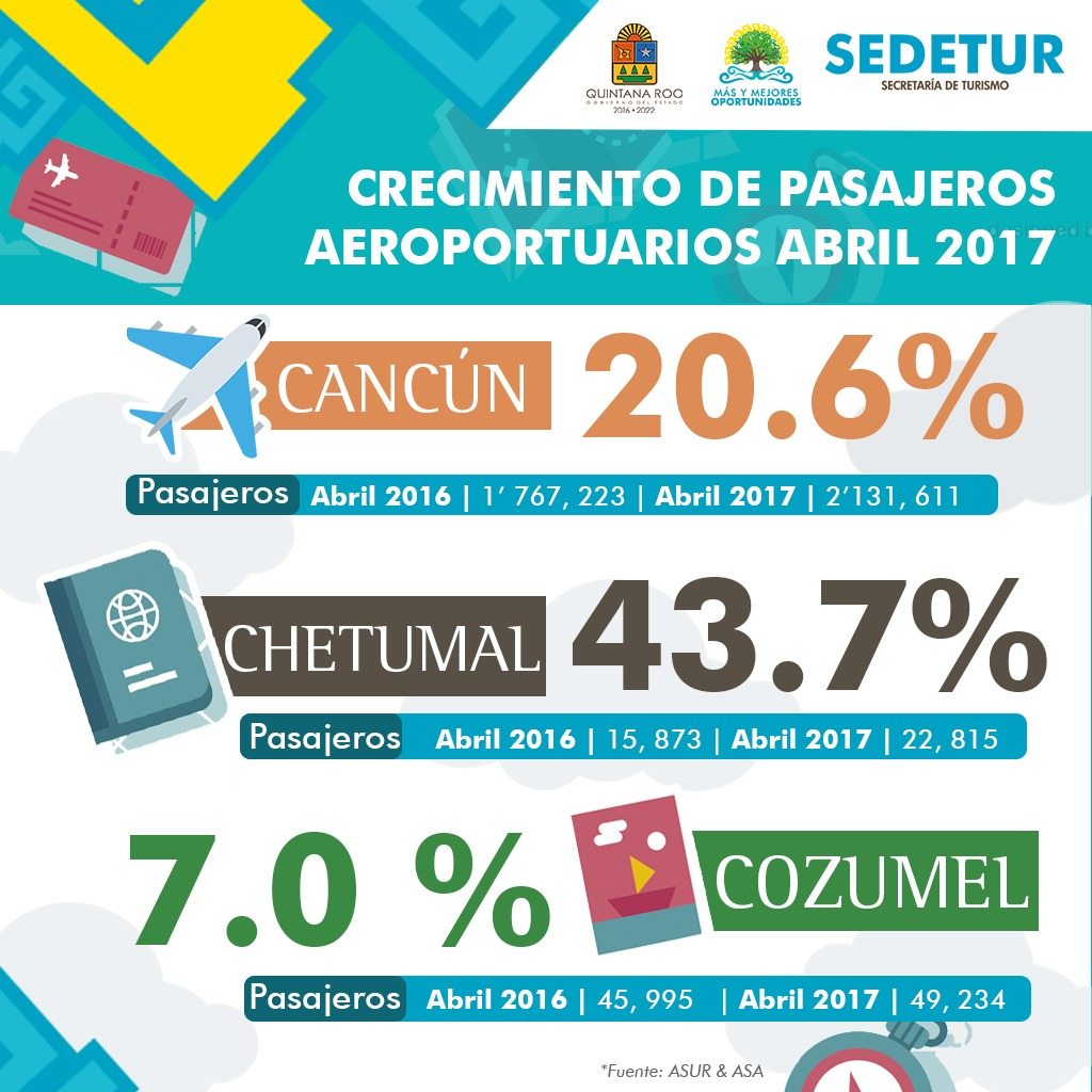 En el mes de abril, el Aeropuerto Internacional de Cancún operado por Grupo ASUR, recibió 649 mil 971 pasajeros nacionales, 180 mil 762 más que en abril de 2016 cuando atendió a 469 mil 209 pasajeros.