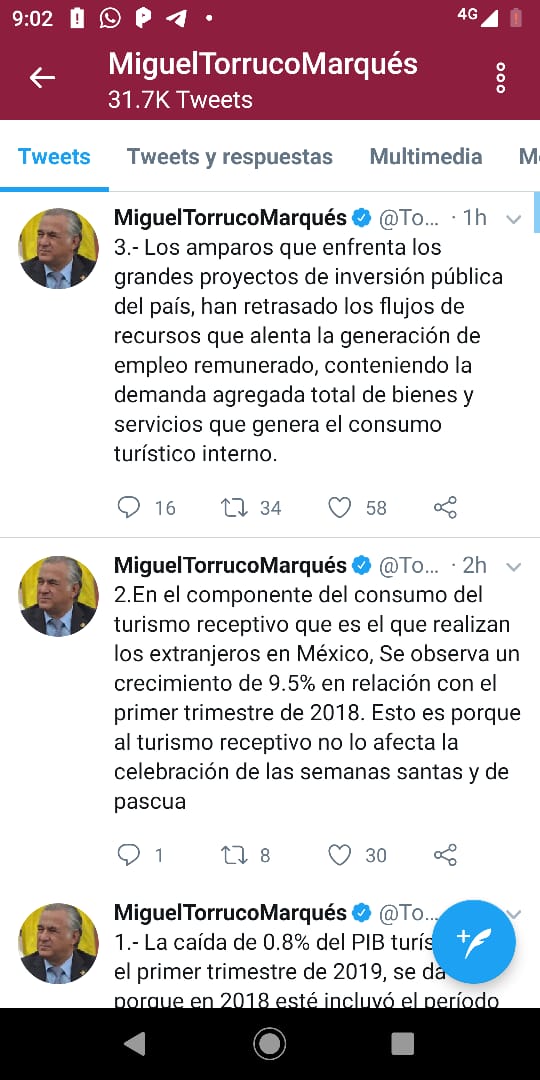 “2.En el componente del consumo del turismo receptivo que es el que realizan los extranjeros en México, Se observa un crecimiento de 9.5% en relación con el primer trimestre de 2018. Esto es porque al turismo receptivo no lo afecta la celebración de las semanas santas y de pascua.”, escribió en su cuenta de Twitter.