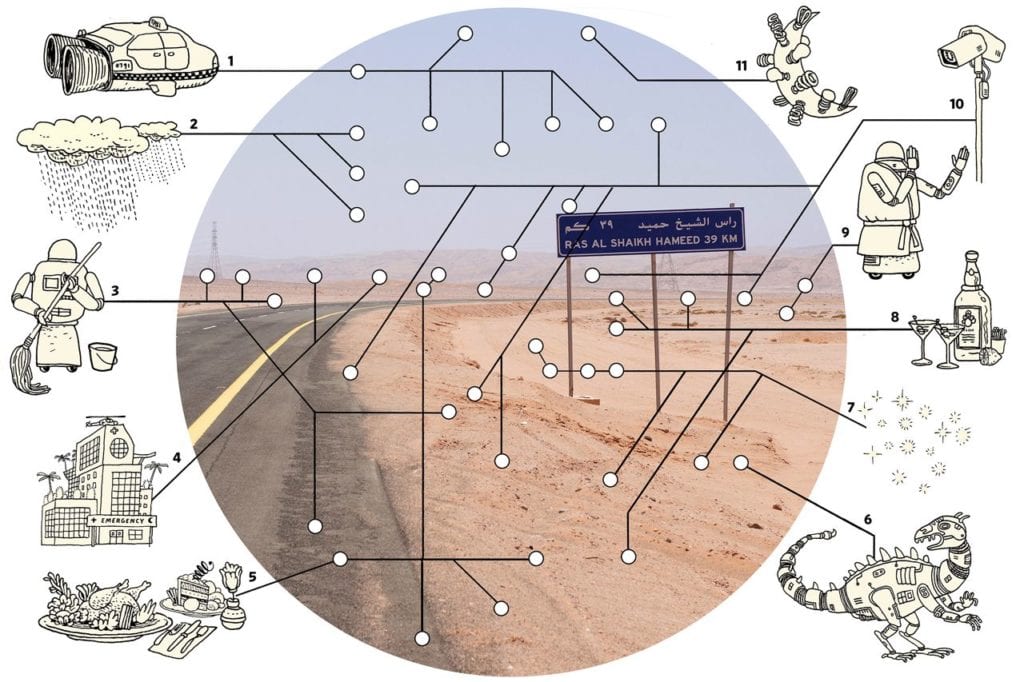 Sin duda este es uno de los proyectos más ambiciosos de Arabia Saudita, pues se dice que la ciudad arrancará con una inversión inicial de 500.000 millones de dólares y contará con elementos extraídos de los sueños más locos que hayamos imaginado jamás. Por poner un ejemplo, se habla de taxis voladores, un parque de dinosaurios robots, lluvia artificial e incluso una luna que brillaría todas las noches para iluminar la ciudad, según The Wall Street Journal.