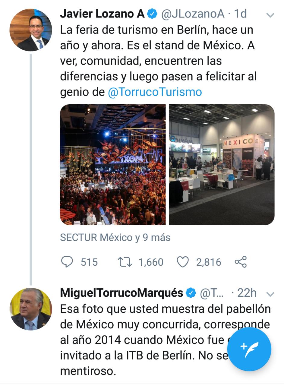 Dicha situación fue aclarada en otro “twitt” a Lozano, cuando Miguel Torruco le hizo saber que las fotos “de hace un año” en realidad correspondían a las de 2014, cuando México fue país invitado a dicho evento internacional.