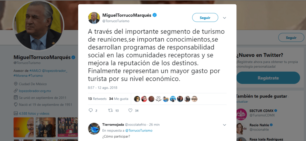 En su cuenta de Twitter, quien llevará las riendas de la Secretaría de Turismo, instancia que el presidente electo Andrés Manuel López Obrador trasladará a Chetumal, informó que el turismo de reuniones significa el 25% del consumo de alimentos y bebidas y ocupa el 23% de los cuartos de hotel.