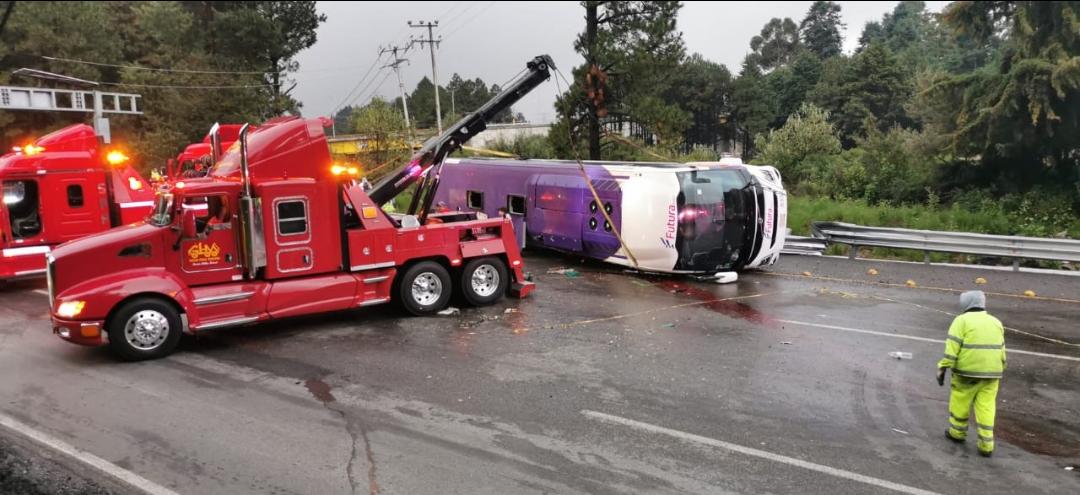 El autobús se volcó en el kilómetro 037 + 900 de la carretera México-Toluca a la altura del poblado de Ocoyoacac, Estado de México.