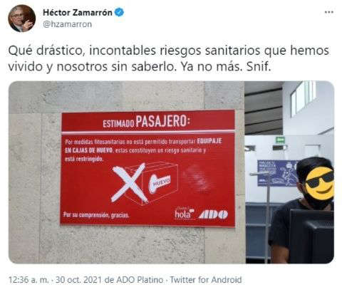 En Twitter, Zamarrón mostró un anuncio de ADO donde se lee: “por medidas fitosanitarias no está permitido transportar equipaje en cajas de huevo, estas constituyen un riesgo sanitario y está restringido”.