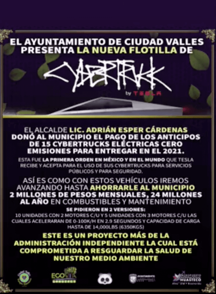 ¿De verdad Ciudad Valles necesita 15 unidades Cybertruck eléctricas cero emisiones para 2021?