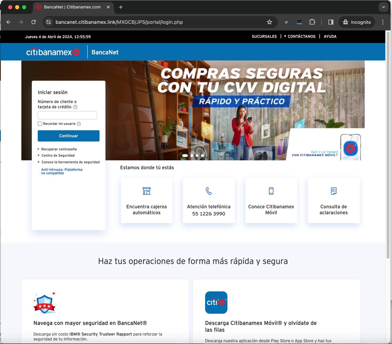 Al hacer click en el enlace, lleva a las personas al subdominio https://bancanet.citibanamex.link, el cual tiene un clon perfecto de la página web de Citibanamex e inclusive cuenta con un banner que sugiere descargar la app de Banamex.
