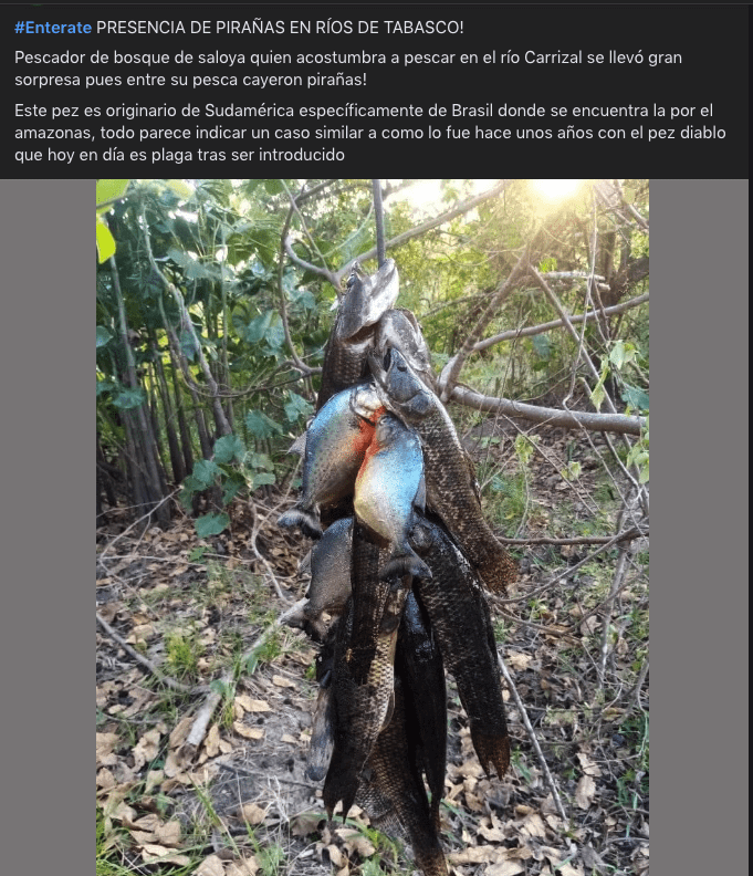 Se han encendido las alarmas dentro de la comunidad científica y de los habitantes de Tabasco, pues recientemente se compartió en redes sociales la captura de lo que podría ser una piraña en ríos del estado.