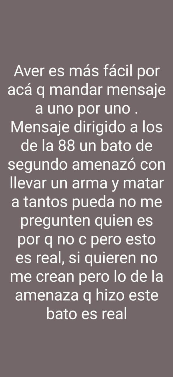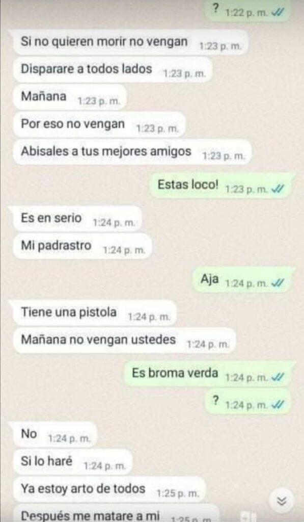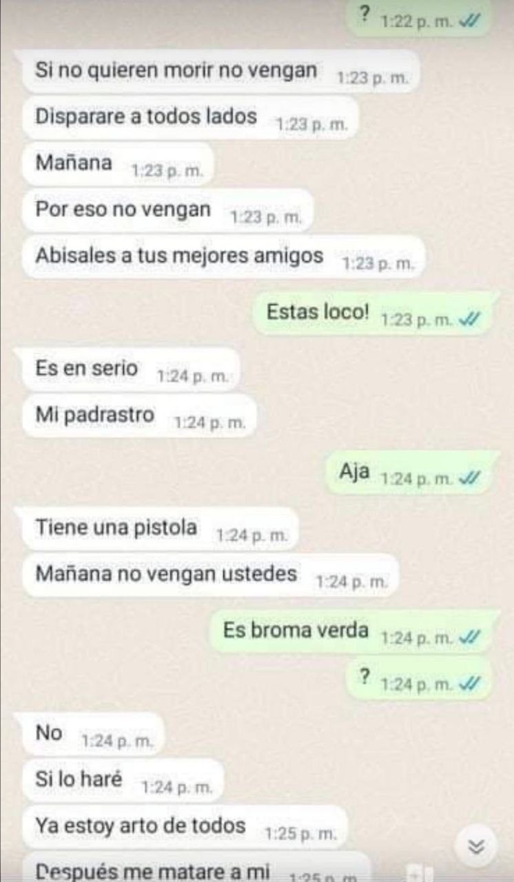 En redes sociales también se difundió una captura de pantalla sobre una supuesta conversación entre el menor de edad implicado y uno de sus compañeros, donde el primero le pide no acudir a la escuela bajo la advertencia de que “disparará a todos lados”, ya que cuenta con un arma que es propiedad de su padrastro.