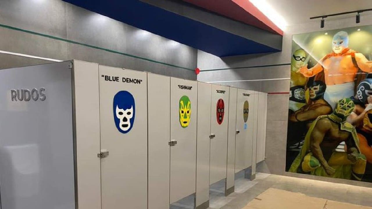 El baño de hombres está dedicado a figuras de la lucha libre mexicana. Como ejemplo, “El Santo”. Mientras que el de mujeres integra lugares emblemáticos de la Ciudad de México (CDMX).