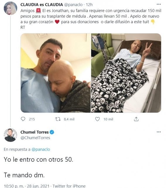 “Amigos él es Jonathan, su familia requiere con urgencia recaudar 150 mil pesos para su trasplante de médula . Apenas llevan 50 mil . Apelo de nuevo a su gran corazón para sus donaciones o darle difusión a este tuit”, se lee.