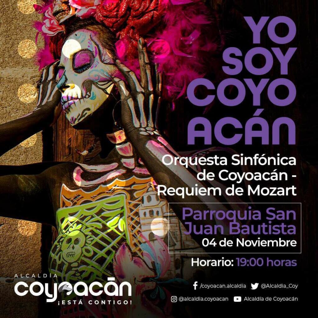 Antes de la pasarela de catrinas, habrá un recorrido que comenzará en la Casa de la Cultura “Reyes Heroles” y que llegará en su peregrinar hasta el Jardín Hidalgo. Otro evento a destacar, dijo Giovani Gutiérrez, es un concierto extraordinario en el atrio de la Parroquia de San Juan Bautista: “Ahí se podrán deleitar con el ‘Requiem de Mozart’, una gran pieza interpretada por la Orquesta Sinfónica de Coyoacán. Será una conmemoración hermosa en donde convergerán arte, cultura, música y gastronomía“.