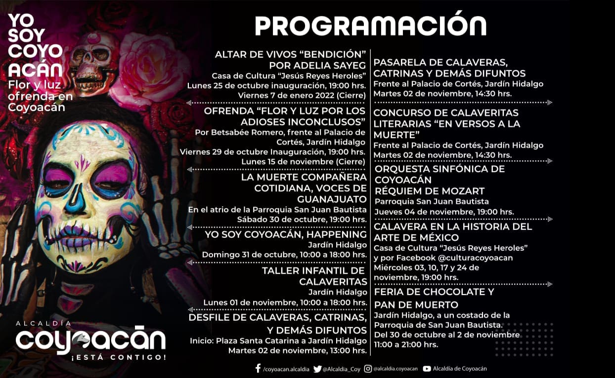 Las actividades estarán distribuidas en las diferentes zonas del centro de la alcaldía de manera que puedan visitar Coyoacán más de un día, por ejemplo, la “Feria del Chocolate y el Pan de Muerto” tendrá lugar en el Jardín Hidalgo; la exposición “Altar de Vivos” de Adelia Sayeg, en la Casa de Cultura “Reyes Heroles” o la “Pasarela de Calaveras, Catrinas y demás Difuntos“, frente al Palacio de Cortés.
