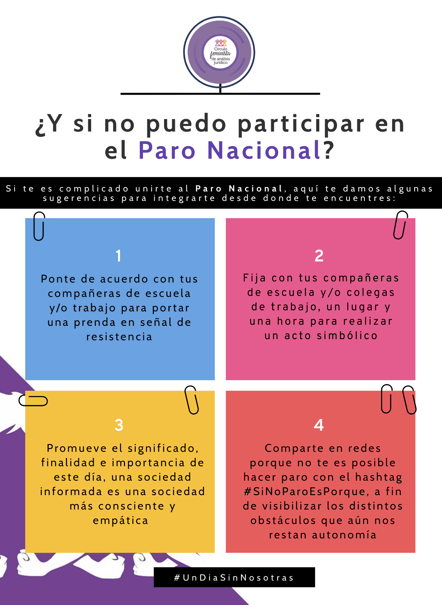 Círculo Feminista de Análisis Jurídico publicó en su cuenta de Facebook diversas opciones de protesta para las mujeres que quieran participar en el paro pero no puedan faltar a sus actividades.