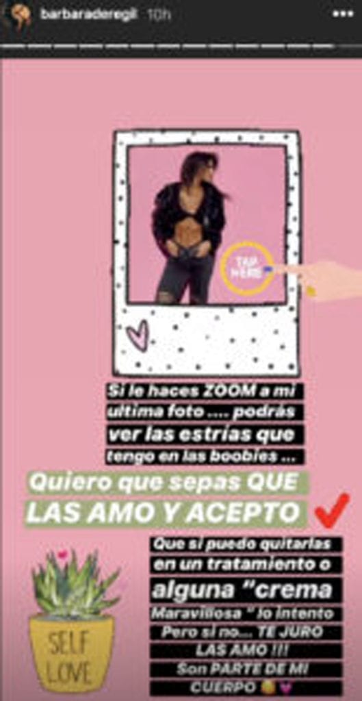 “Si le haces zoom a mi última foto podrás ver las estrías que tengo en las boobies. Quiero que sepas que las amo y acepto. Que si puedo quitarlas en algún tratamiento o alguna ‘crema maravillosa’ lo intento, pero si no te juro las amo. Son parte de mi cuerpo”, escribió la actriz.