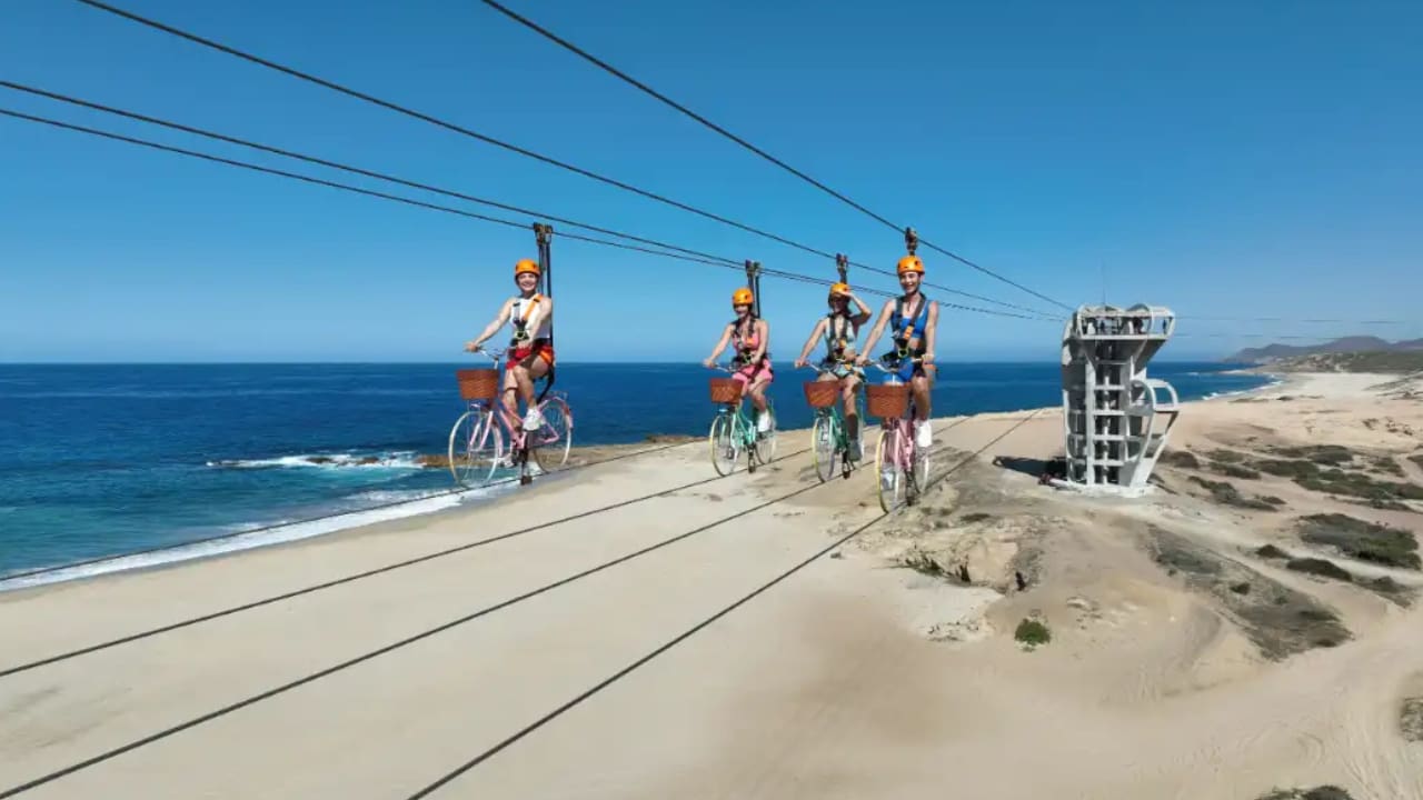 Conocida como Sky Bike, la bicicleta aérea más larga del mundo se encuentra en Playa Migriño, una comunidad a solo 30 minutos en automóvil desde Cabo San Lucas, en Baja California Sur.