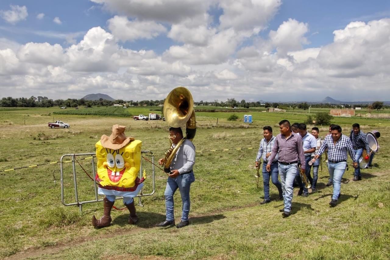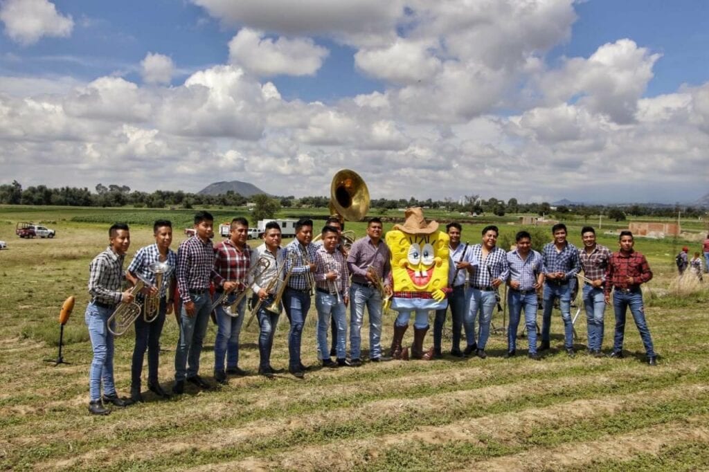 El nombre de la banda es “Vientos del Sur“, sus integrantes son de Oaxaca y decidieron acudir al socavón de Puebla para grabar su sencillo titulado “Bob”, y para ello llevaron una botarga, de Bob Esponja.