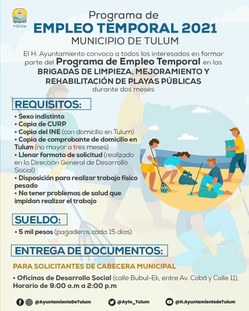 A través de la Dirección de Zona Federal Marítimo Terrestre y la Dirección General de Desarrollo Económico, quienes resulten contratados recibirán un sueldo quincenal de 5 mil pesos durante dos meses, laborarán en brigadas para cubrir turnos de 6:00 a 12:00 horas y de 13:00 a 17:00 horas, en labores del limpieza y retiro de sargazo en las principales playas públicas.